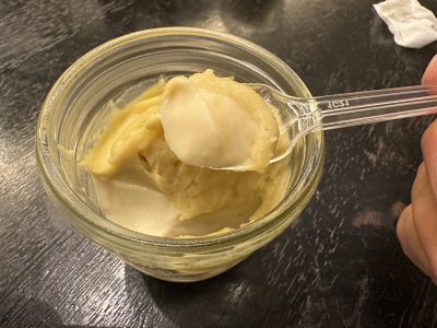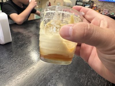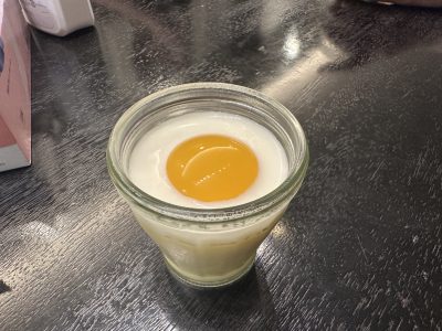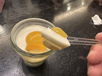 真ん中はオレンジのボールゼリー、そして白身にミルクゼリー