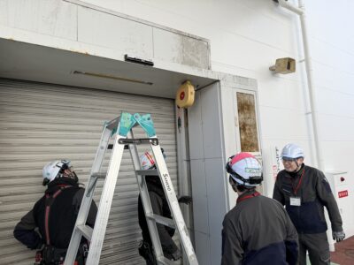 シャッター屋さん達がエアカーテンの打合せをしている