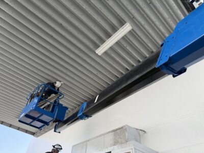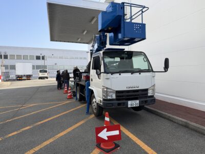 間に高所作業車を設置し作業開始(‘ω’)ノ