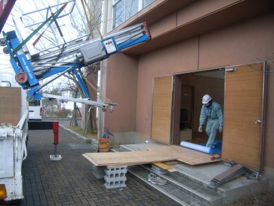 体育館の入り口付近までユニックが寄り付けることができれば、