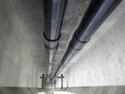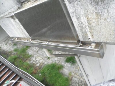橋げたの下に、こちらはステンレス製の樋がついていますが、