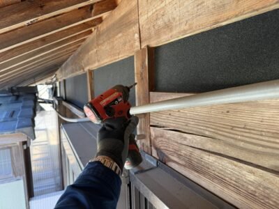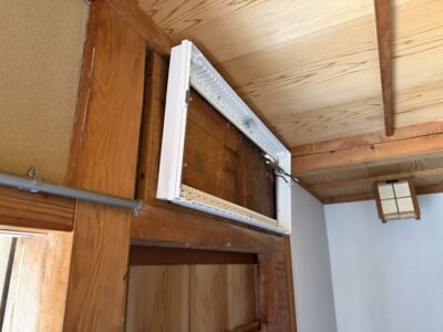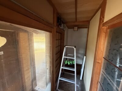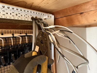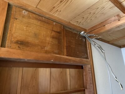屋外との貫通穴から古い電線を撤去していきます(; ・`д・´)