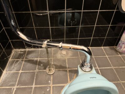 錆びた鉄骨の裏を通って右下へと配管されており、
