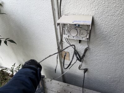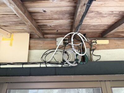 防水コンセントは電話の保安器の横で 強弱、いろんな線を