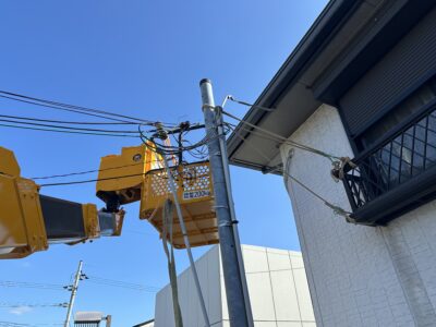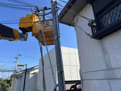 古い引込柱を吊り上げます(‘ω’)ノ